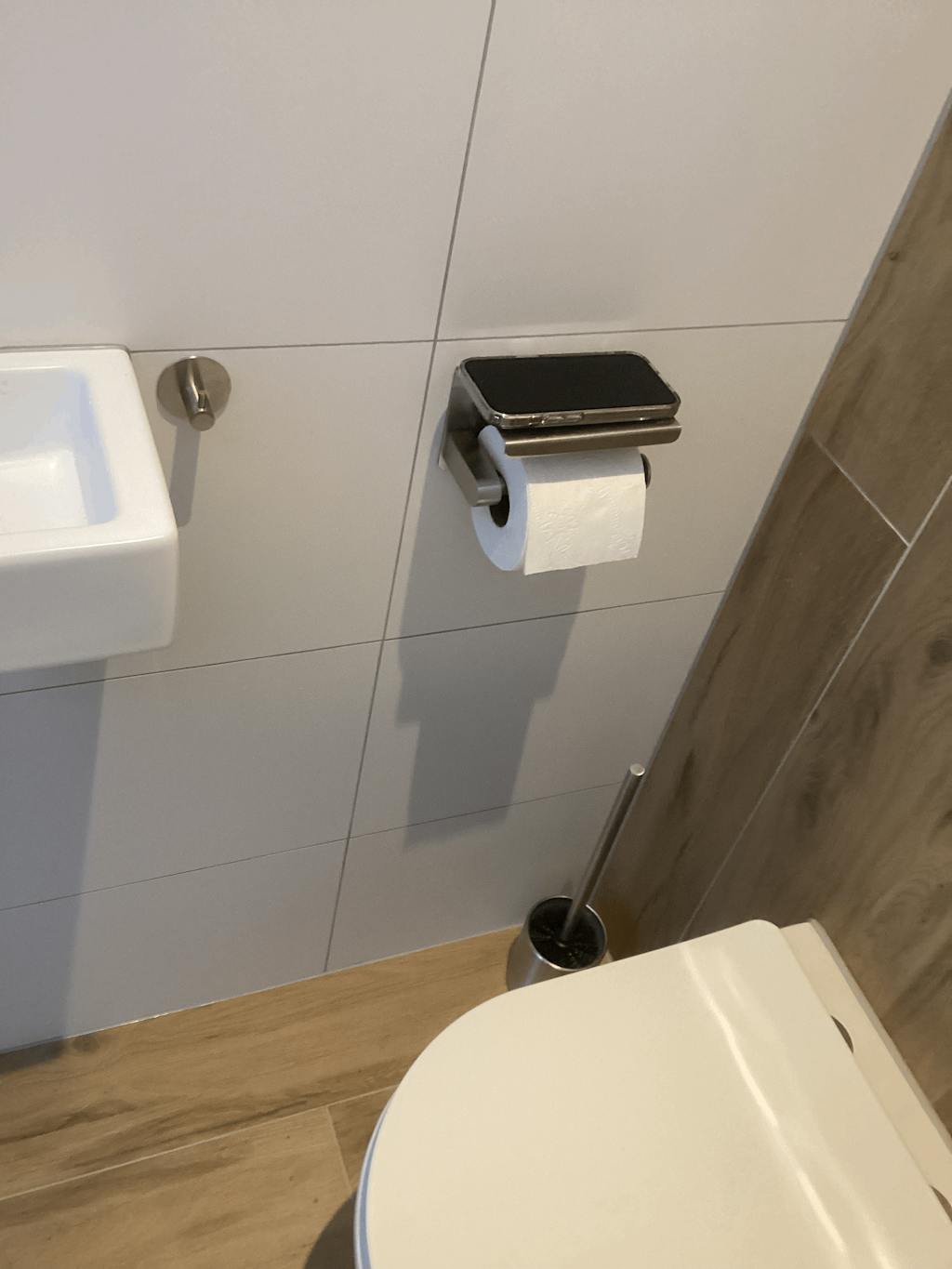 Toiletrol houder met plankje ziet er mooi uit.